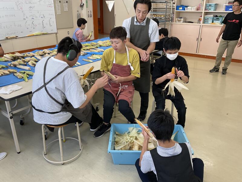 9月22日(月)の作業学習において、イエローポップの収穫を行いました。収穫本数は全部で217本となり、作業学習室に運んだ後、みんなで皮をむき、乾燥させるために吊るしました。 イエローポップは「爆裂種」と呼ばれるトウモロコシで、加熱するとポップコーンになります。11月1日(土)に本校高等部で開催される「製品フェア」では、商品として販売いたします。ぜひご期待ください。